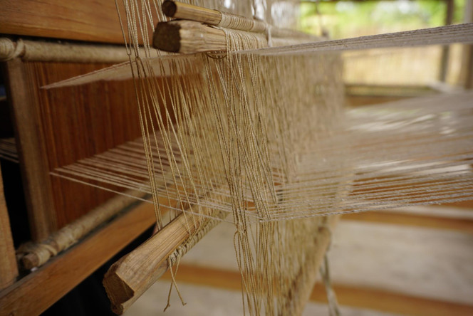 Wir sind natürlich ein paar Tage später wieder gekommen, weil wir zum einen zu diesem schönen Ort zurück kehren und zum anderen unsere eigenen Schals weben wollten. Aber bevor es an die Webstühle ging, mussten wir unser eigenes Bündel Baumwolle herstellen – und bereits hier haben wir etwas zu kämpfen gehabt. Was den Damen locker flockig von der Hand ging bedeutete für uns vollste Konzentration und dennoch war es schwierig. Aber sie waren sehr geduldig mit uns und haben uns Schritt für Schritt gezeigt, wie man zuerst die Samen aus der Baumwolle los wird, die Baumwolle anschließend fluffig "schlägt", um sie dann auf einem Bambus-Stab aufzurollen.