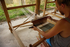 Wir konnten uns weitere vorgefärbte Baumwolle aussuchen und ab ging es endlich an den Webstuhl. Man muss sich das ein bisschen wie Schlagzeug spielen vorstellen: jede Hand und jedes Bein macht eigentlich was anderes und muss daher sortiert und koordiniert werden. Es ging eine Weile, bis wir das Schema durchschaut hatten - und Profis sind wir mit Sicherheit keine geworden, aber es hat unheimlich Spaß gemacht.