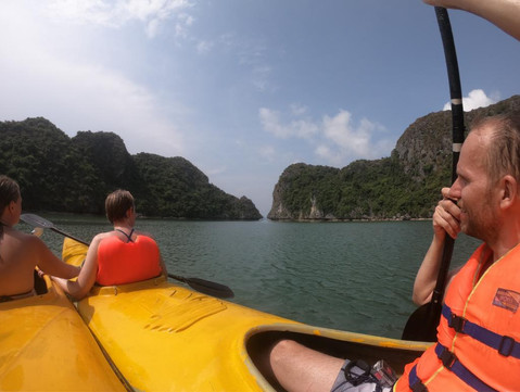 Am folgenden Tag ging es früh morgens los und aufs Boot. Wir hatten Glück und das Boot, das eigentlich bis zu 50 Leute fassen könnte war nur mit 14 Leuten, inklusive uns besetzt. Die Laune wurde besser, spätestens nachdem wir unseren vietnamesischen Kaffee an Deck ausgetrunken hatten und sich langsam die Sicht auf die vielen Inseln lichtete.
