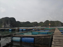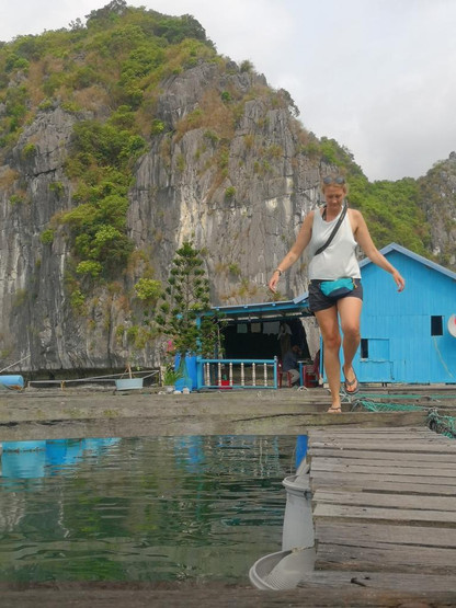Wir sind zuerst durch die Lan Ha Bay geschippert, wo der erste Stopp eine Fischfarm war. Wir sind von Bord gegangen, um über die Planken zu balancierten und in die einzelnen Fischtanks zu schauen.