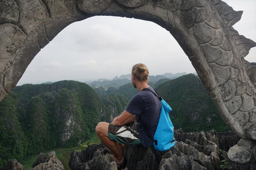 Für die restliche Reisegruppe Vietnam ging es also zur 20 Fahrminuten entfernten Mua Cave. Auf dem Weg dahin haben diverse Leute versucht uns davon zu überzeugen, dass man jetzt parken und den Rest zu Fuß gehen muss. Die Frau mit der Trillerpfeife hat es dann geschafft und wir liefen den Rest bis zur Treppe. Nach 600 schweißtreibenden Stufen hinauf zum Mua Cave Aussichtspunkt waren wir ganz schön erledigt Wie man sieht, hat sich aber jede einzelne Stufe gelohnt, denn die Aussicht war fantastisch.