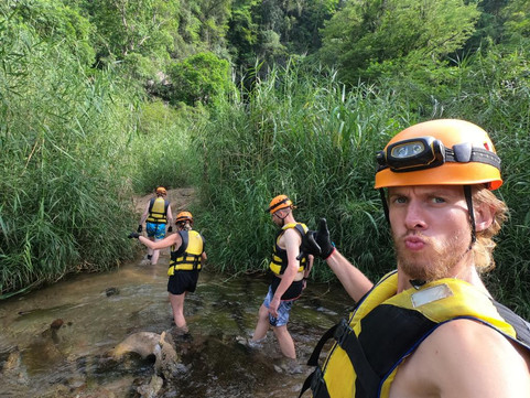 Erfrischt und satt ging es nochmal eine Stunde weiter durch den Dschungel, bis wir an einer Höhle ankamen, deren Namen wir nicht mehr wissen. Die Höhle war keine trockene Höhle wie die Elephant Cave, sondern sogar ziemlich nass. Genauer gesagt fließt hier ein unterirdischer Fluss durch. Was macht man also? Schwimmweste an, Helm mit Lampe auf den Kopf und rein ins kühle Nass. Umso weiter wir schwammen, desto dunkler wurde es. Irgendwann waren unsere Lampen das einzige Licht weit und breit. Dann sollten wir alle gemeinsam das Licht ausschalten und die völlige Dunkelheit genießen. Wir konnten nur noch erahnen, wo wir her gekommen waren. Ohne Licht paddelten wir auf den einzigen etwas helleren Bogen zu, den wir sahen und kamen wieder heile am Ausgang an. Zeitweise war das ganz schön unheimlich aber ein absolut tolles Abenteuer.