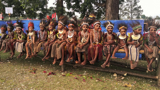 Etwas scheuer und gleichzeitig sehr verspielt erschienen uns die Singsing Gruppen aus Küstennähe. Die Gruppe Yagas hatten wir bei den Vorbereitungen begleitet und als wir die anderen Gruppen sahen, fiel uns auf, dass manche davon ein paar typische Merkmale gemeinsam hatten. Da war zunächst die rote, ölige Farbe, mit der Gesicht und Körper eingerieben wurde, auch die Baströcke und Muschelketten sahen wir wieder, genauso wie den Kopfschmuck aus Federn. Darüber hinaus hatten einige aus Holz geschnitzte Fische dabei und weitere Attribute aus dem Meer.
