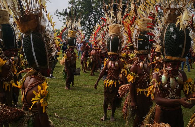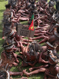 Der Auftritt der Stämme aus der Provinz Mount Hagen war im Vergleich zu den anderen schon beinahe etwas aggressiv. Zuerst es schienen ausschließlich Männer-Gruppen zu sein, die in einer klaren Formation den Sportplatz betraten, ihr Gesang erinnerte dabei eher an Schlachtrufe, mit denen man imponieren bzw. einschüchtern wollte. Besonders auffällig waren die aufwendig geschminkten Gesichter, mit klar definierten Linien und knalligen Farben – aber schaut es euch in der Slideshow am besten selbst in Ruhe an.