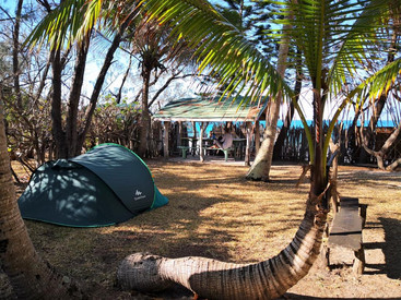 Damit begann also die Reise nach Ile des Pins, einer der Inseln, die noch einen drauf setzt, was die sowieso schon teuren Preise in Neukaledonien betrifft. Daher war unsere einzige Möglichkeit, mal wieder zelten zu gehen. Da wir ankamen, als es bereits dunkel war, hatten wir uns einen Abholservice gebucht. Der liebe William konnte Englisch und so konnten wir uns auf der Fahrt ein bisschen mit ihm unterhalten. Wir erzählten, dass wir gerne tauchen gehen würden, aber leider niemand auf unsere beiden Emails geantwortet hat. Er fuhr kurzerhand rechts ran, nahm sein Handy in die Hand und vereinbarte zwei Tauchgänge für uns. So einfach ist das, wenn man die Sprache spricht. Wir waren ihm sehr dankbar und kamen nach kurzer Zeit auf dem Rouleaux Camping Platz an, wo es für schlappe 32€ die Nacht einen abgegrenzten Zeltplatz mit Zelt, zwei leider kaputte und damit flache aufblasbare Matten, ein Gemeinschaftsbad und eine Grillstelle gab. Eine Küche gab es keine. Das versprach eine abenteuerliche Nahrungsaufnahme. Dafür war er wunderschön gelegen, direkt an einem einsamen Strand, wo es außer des Roleaux keine weiteren Unterkünfte gab.