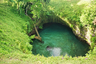 Es war noch recht früh morgens, wir hatten strahlenden Sonnenschein und saßen im Mietauto. Endlich ging es auf Entdeckungstour auf Upolu und eben jenem besagten „Wasserloch“. Während Tom alle Zeit der Welt hatte, konnte Sabrina es kaum erwarten, endlich dort anzukommen. Sie wollte das „Wasserloch“ für sich alleine haben und daher pünktlich zur Öffnung morgens da sein. Sie hatte absolut kein Verständnis dafür, dass Tom morgens erstmal noch anmerkte, dass man ja zuerst in die entgegen gesetzte Richtung fahren müsse, um den Tank aufzufüllen – das hätte er ja auch am Abend zuvor sagen können, als wir das Mietauto bekommen hatten, dann wäre man einfach früher aufgestanden. Nun gut, nach diesem Umweg ging es endlich in die richtige Richtung. „Aber da war doch das Schild zum Wasserfall, den wir uns anschauen wollten!“ protestierte Tom auf den ersten Kilometern. „Den schauen wir uns morgen an, fahr weiter“ war die einzige Reaktion von Sabrina dazu. So fuhren wir nicht nur am Wasserfall vorbei, sondern auch am Fluss, der unterwegs war und an diversen Möglichkeiten, einen Kaffee zu trinken, den Tom sehr gerne gehabt hätte. Langsam aber sicher wurde die Stimmung im Auto nicht nur wegen der eingeschalteten Klimaanlage eisig. Nach einer weiteren Stunde Fahrt mit absolutem Schweigen, kamen wir endlich an und waren tatsächlich die ersten. Und beim Anblick eben jenes Wasserlochs, war das Eis auch wieder gebrochen. Sabrina hatte vor längerer Zeit bereits ein Bild davon gesehen aber wieder vergessen, wo es war. Als wir am ersten verregneten Tag die Broschüre angeschaut hatten, erkannte sie es sofort wieder. Die steile Leiter, die in ein mit üppigen Pflanzen bewachsenes Loch zum türkis blauen Wasser führt. Wenn das mal nicht wunderschön ist! Und wir hatten es tatsächlich erstmal für 30 Minuten für uns alleine, bevor weitere Besucher kamen, darunter auch eine 20 köpfige Reisegruppe.