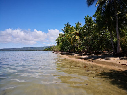 Da das Kaffee Pulver alle war und eines der Kinder zum Laden geschickt wurde, um neues zu holen, kamen wir mit der freundlichen Besitzerin ins Gespräch und plauderten lange mit ihr, bis sich das Hausschwein zu uns gesellte, das liebevoll gestreichelt wurde. Während wir nicht nur unseren Kaffee tranken, sondern auch noch Kokosnuss, Papaya und Marmeladen-Toastbrot dazu serviert bekamen, erzählte uns die Besitzerin, dass es eine halbe Fußmarsch am Strand entlang den Aganoa Strand mit schwarzem Sand gäbe, der wunderschön sei. Wir könnten das Auto auf ihrem Grundstück geparkt lassen und ein bisschen über den Strand schlendern. Die Sonne knallte erneut ohne Gnade auf unsere Köpfe, es war um 11 Uhr morgens bereits unfassbar warm und wir beschlossen sofort aufzubrechen, bevor es noch heißer werden würde. Das war zwar ein cleverer Gedanke gewesen, wir hatten aber ohne das Meer geplant und mussten dank Flut des Öfteren durchs Wasser waten oder uns stellenweise durchs Dickicht schlagen, um voran zu kommen. Und so liefen und liefen wir und es wollte sich einfach kein schwarzer Sand unter unseren Füßen zeigen. Statt der angekündigten halben Stunde waren wir bereits die doppelte Zeit unterwegs und völlig nass geschwitzt. Wir machten eine Pause und schauten uns das ganze nochmal auf der Karte an. Irgendwie mussten wir wohl dran vorbei gelaufen sein. Nun denn, dann würden wir es ja auf dem Rückweg sehen. Wir machten also kehrt und hatten das Meer dieses Mal auf unserer Seite, denn die Flut ging stetig zurück und wir kamen deutlich schneller voran. Als wir erneut an besagter Stelle ankamen und der Strandabschnitt dieses Mal nicht verborgen im Wasser lag, konnten wir zwar das ein oder andere dunklere Sandkorn ausmachen, unter einem schwarzen Sandstrand, hatten wir uns aber etwas völlig anderes vorgestellt. Wirklich gelohnt hatte sich der lange und beschwerliche Spaziergang zwar nicht wirklich, aber es war trotzdem schön, etwas mehr von dieser wunderschönen Insel entdeckt zu haben.