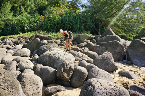 Nach guten 2 Stunden kamen wir am Hanakāpī’Ai Strand an, unserem Ziel. Der Weg würde noch mehrere Kilometer weiter führen und wird noch ein bisschen abenteuerlicher, dafür hätten wir uns aber früher anmelden müssen, um noch einen der heißbegehrten Plätze zu ergattern – und wir hätten Wanderschuhe und ein bisschen mehr Ausrüstung gebraucht, wofür wir einfach nicht ausgestattet sind.