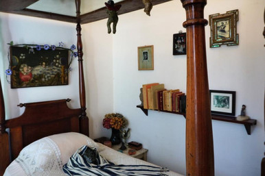Apropos glücklich: so lässt sich Sabrinas Zustand beschreiben, als sie endlich vor dem „Casa Azul“ stand, dem Haus, in dem Frida Kahlo mit ihrem Mann Diego Rivera gelebt hatte. Falls jemandem Frida Kahlo nun so gar nichts sagt, der kennt vielleicht die Dame mit den durchgezogen Augenbrauen und ja genau, das ist besagte Dame. Eine ziemlich starke Frau, die für ihre Zeit sehr viel bewegt hat und sich weder von der Kinderlähmung noch von einem Busunfall hat unterkriegen lassen, bei dem eine Stange ihr Becken durchbohrt hatte. Ihr Leben war bestimmt von der Unfreiheit, denn sie musste viel Zeit im Bett verbringen, gefangen in einem Ganzkörpergips und Stahlkorsett. In diesem Zustand sind viele ihrer Selbstportraits entstanden, die sie mithilfe eines Spiegels malte, der an der Decke ihres Bettes angebracht worden war.